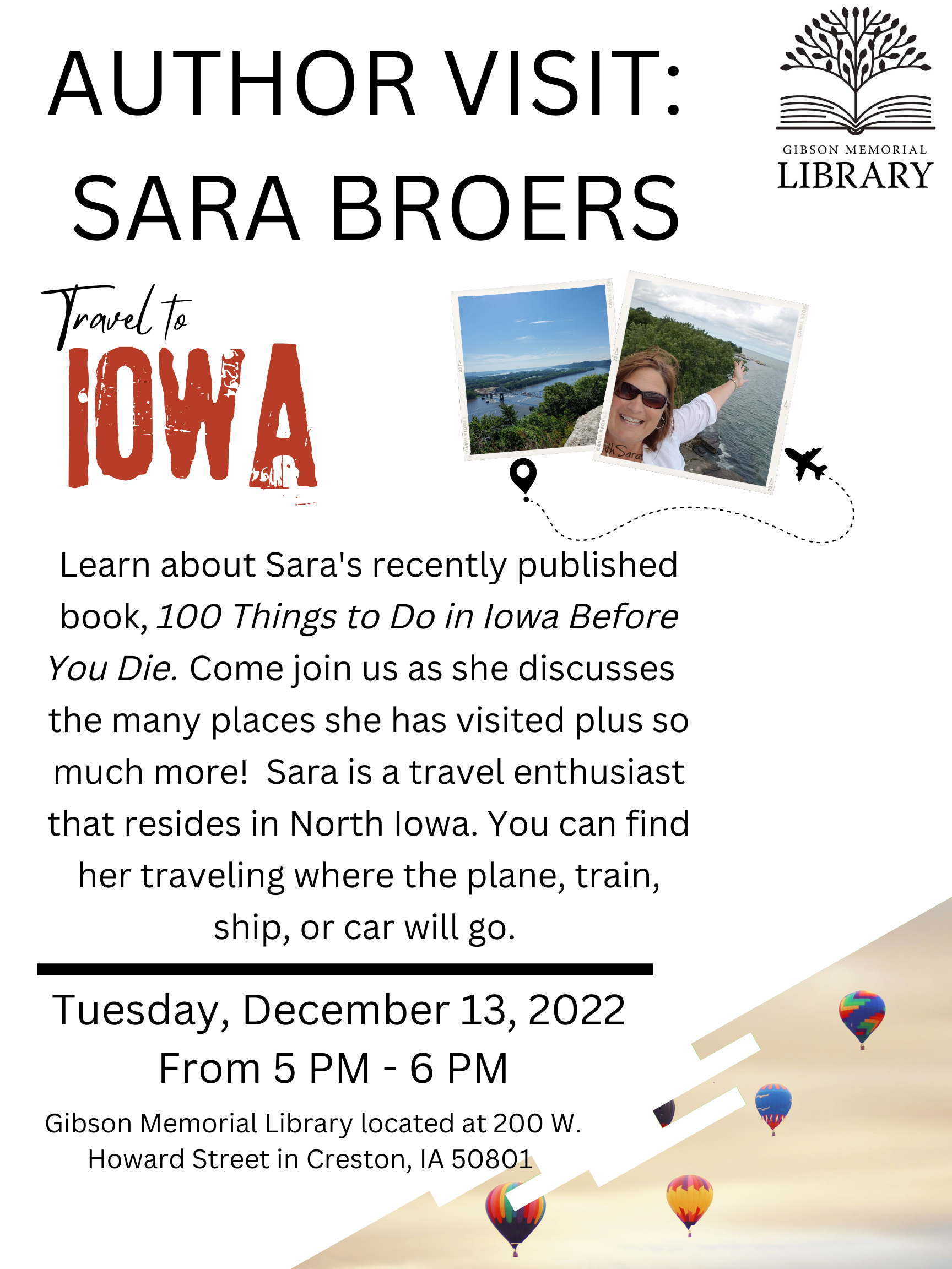 Learn about Sara's recently published book, 100 Things to Do in Iowa Before You Die. Come join us as she discusses the many places she has visited plus so much more! Sara is a travel enthusiast that resides in North Iowa. You can find her traveling where the plane, train, ship, or car will go.